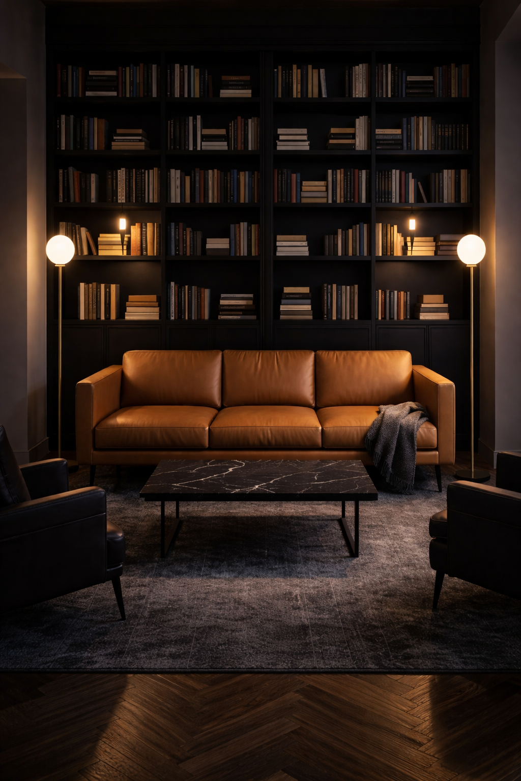 1. Noir Library Lounge with Glowing Picture Lights