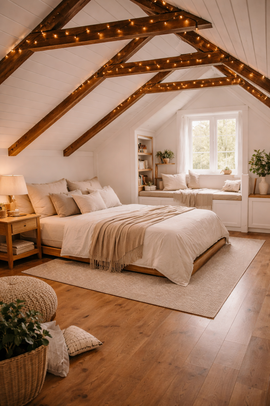 Exposed ceiling beams are not a problem to solve. They are the reason people pay a premium for attic conversions. Lean into them. If the wood is in good condition, clean it and apply a matte finish to bring out the grain. If it is rough or discolored, paint it white with the ceiling for an airy look or a warm dark stain for a more dramatic one. Drape string lights along the beams for evening ambiance that feels expensive and intentional. Hot tip: fairy lights on the beams eliminate the need for a ceiling light fixture, which is often difficult to position correctly in an attic. One thing to know: beams are structural, so never cut, notch, or attach heavy items without consulting a structural engineer. The room gains character that no new construction home can replicate, and the beams become the feature everyone comments on.