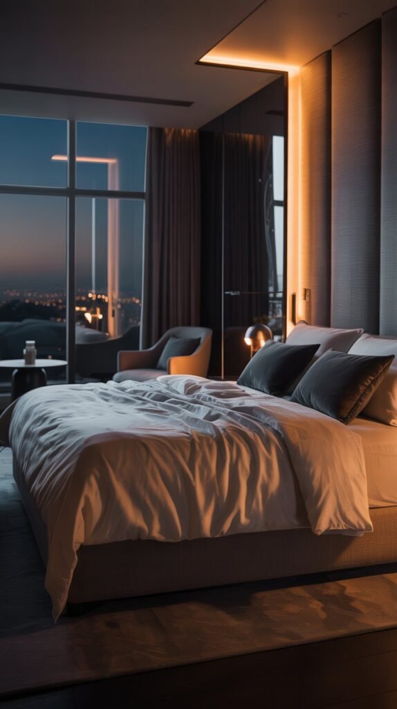- Hidden strip lights under the bed or behind the headboard for a halo effect
