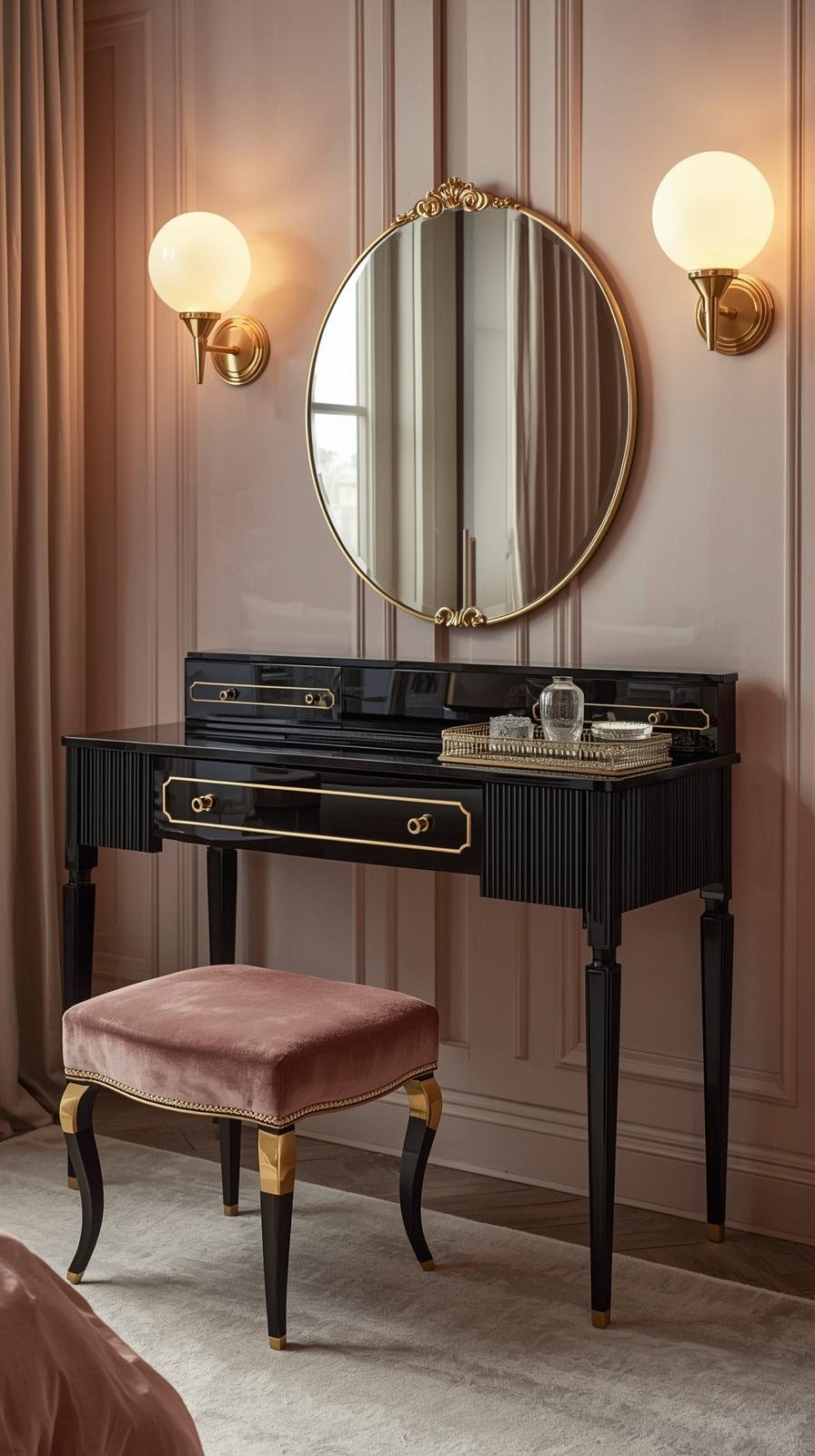 Think Old Hollywood meets real-life mornings. A small corner transforms into a luxe moment with curves, gloss, and a hint of drama that still works on a Tuesday.