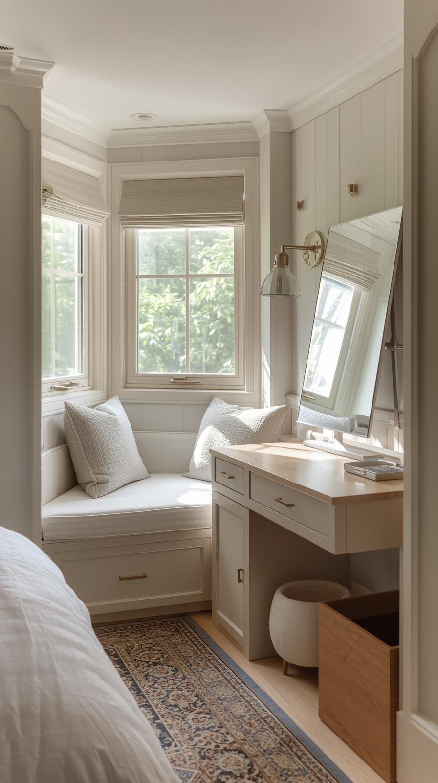 Small room? Steal the bay window. This design turns daylight into your best beauty filter and hides clutter like a pro.