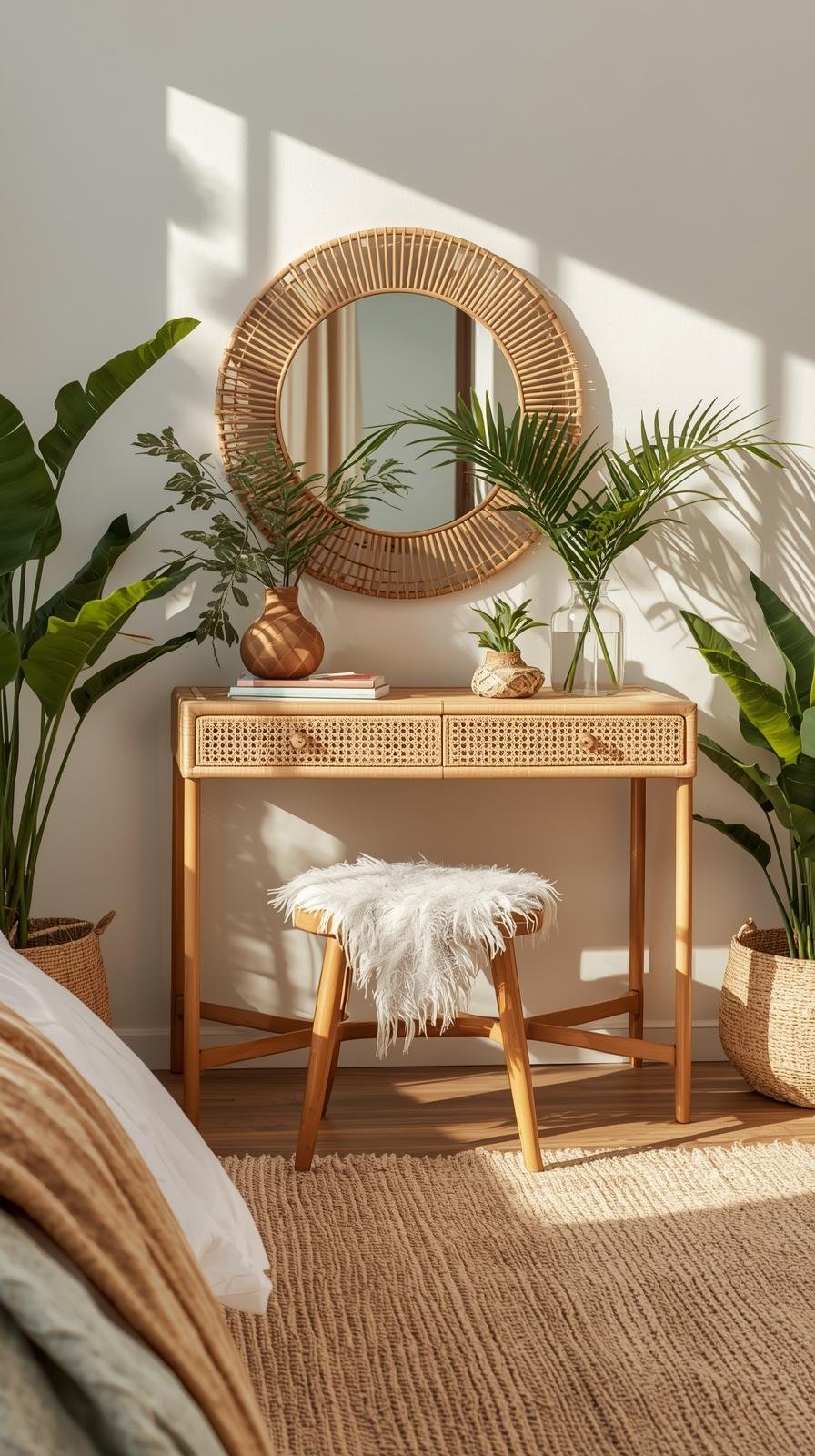 8. Boho-Organic Vanity with Rattan and Warm Woods