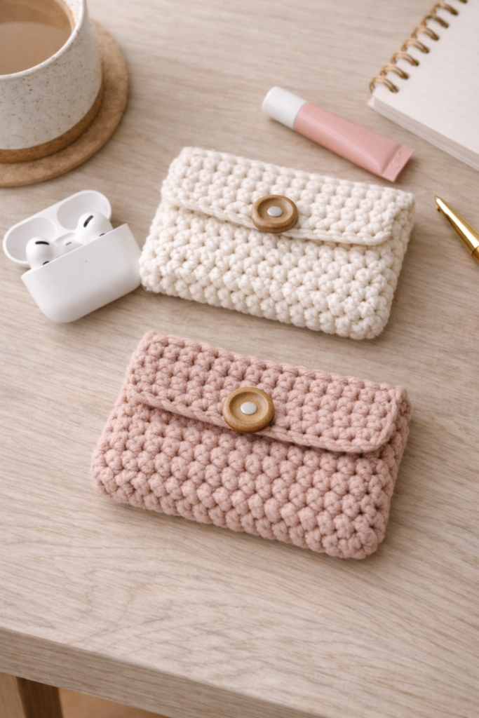 If you’re looking for small crochet ideas that feel practical and giftable, this one’s a winner. Mini crochet pouches are perfect for coins, lip balm, AirPods, or even storing stitch markers. They help you practice straight edges, basic shaping, and simple seaming without committing to a large project. Go neutral for a clean, modern look. Try bright cotton for something playful and summer-ready.