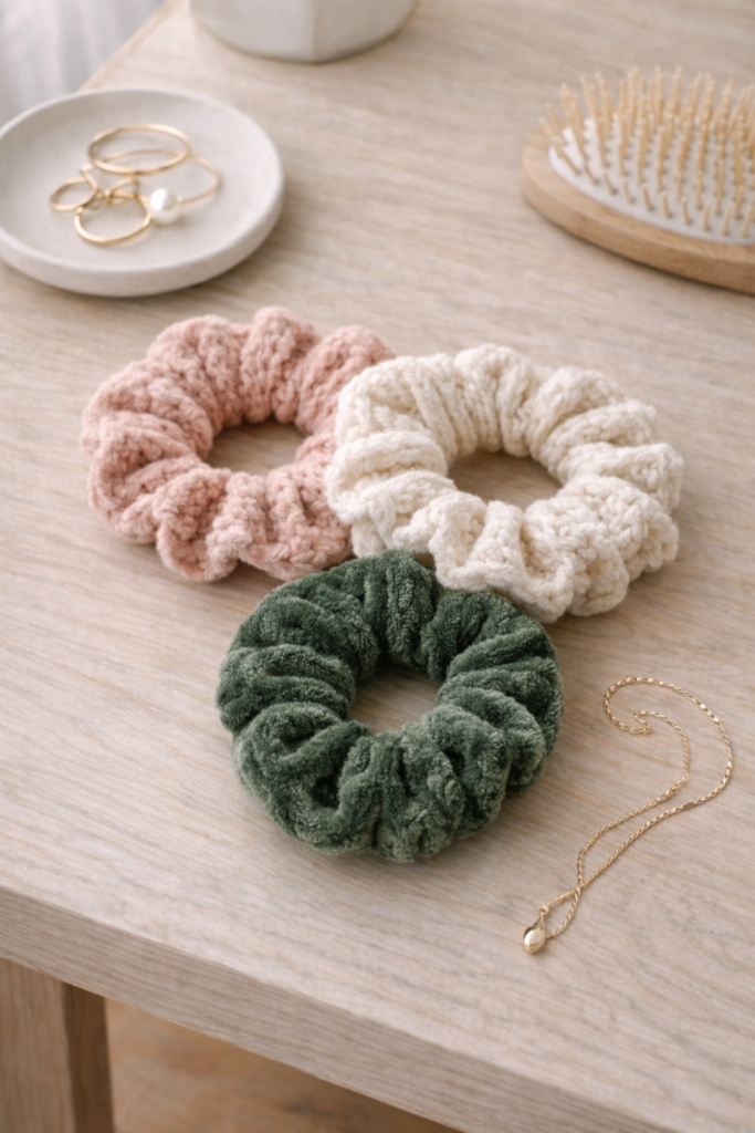 If you want cute crochet ideas that feel fun and low-pressure, scrunchies are it. They’re one of the best small crochet ideas because you’re working around an elastic band, so there’s no stress about shaping or sizing. The texture does all the work. Velvet yarn feels luxe. Cotton feels light and everyday. Bright colors feel playful and bold.