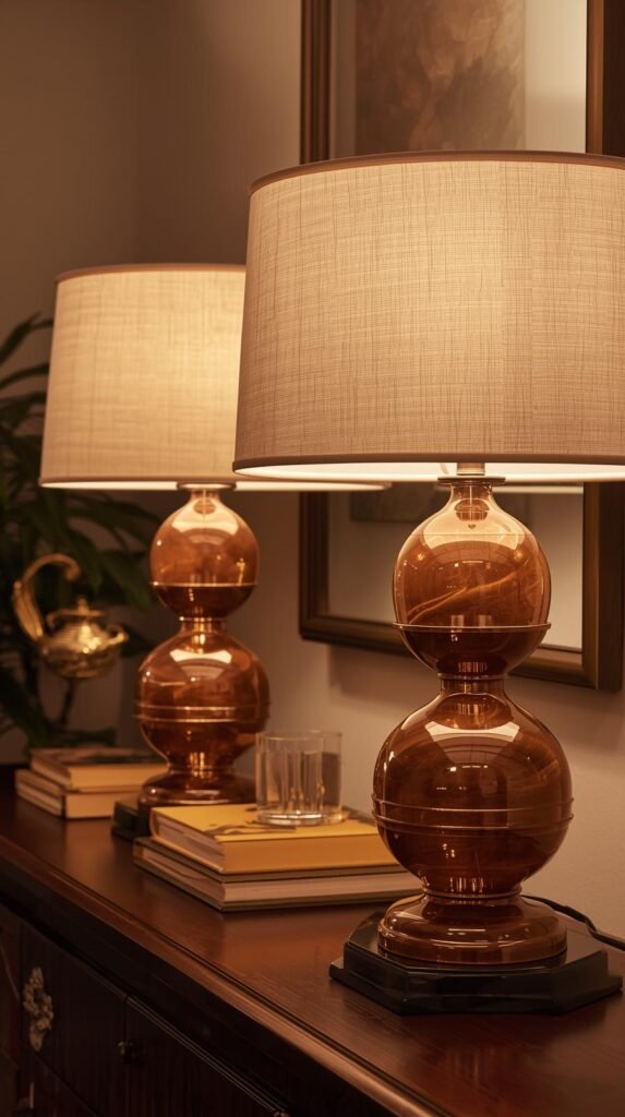 Table lamps with stepped bases and jewel-tone glass or ceramic shades feel glam yet grounded. They add color, glow, and a hit of Deco architecture.