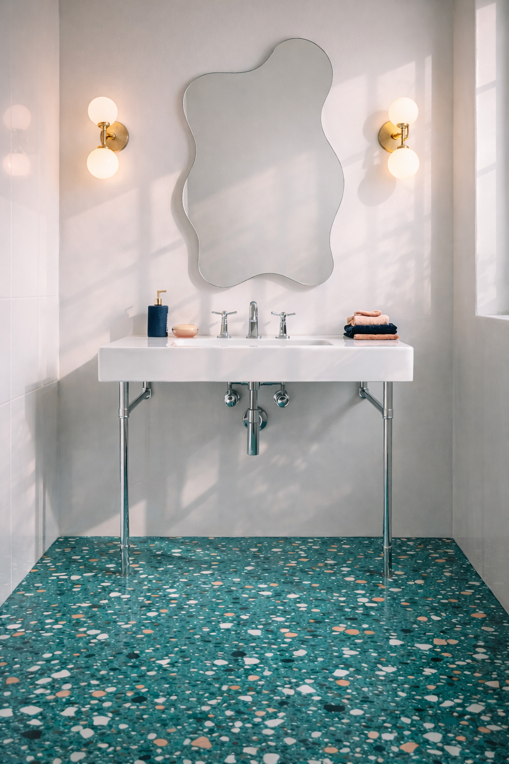 - Turquoise terrazzo floor with white, navy, and peach chips
