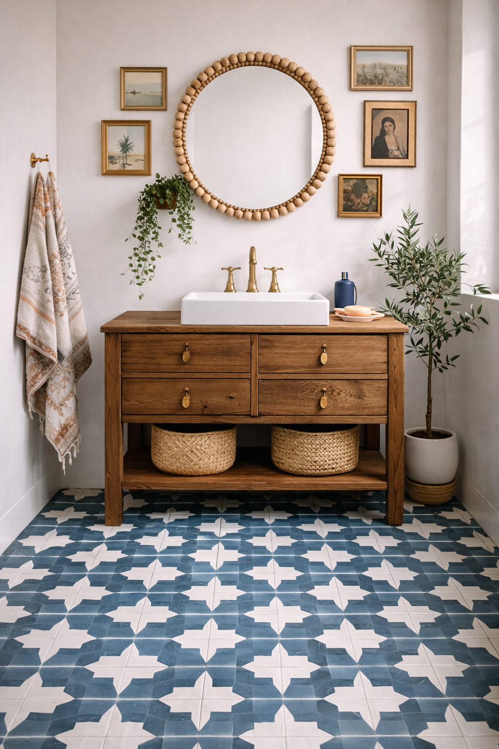 Mix patterns like a pro with denim-blue star-and-cross tiles underfoot. Layer textiles, plants, and vintage finds for warmth.