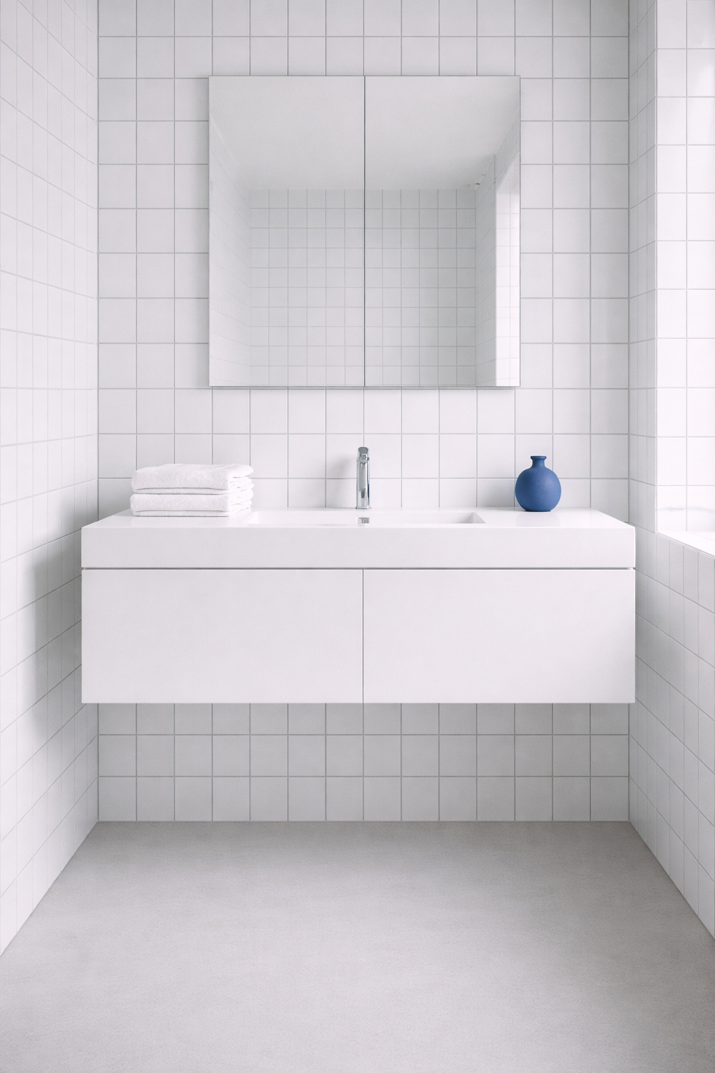 Keep everything else crisp—chrome fixtures, white towels, a single blue vase. For minimalists who still want a wink of color.