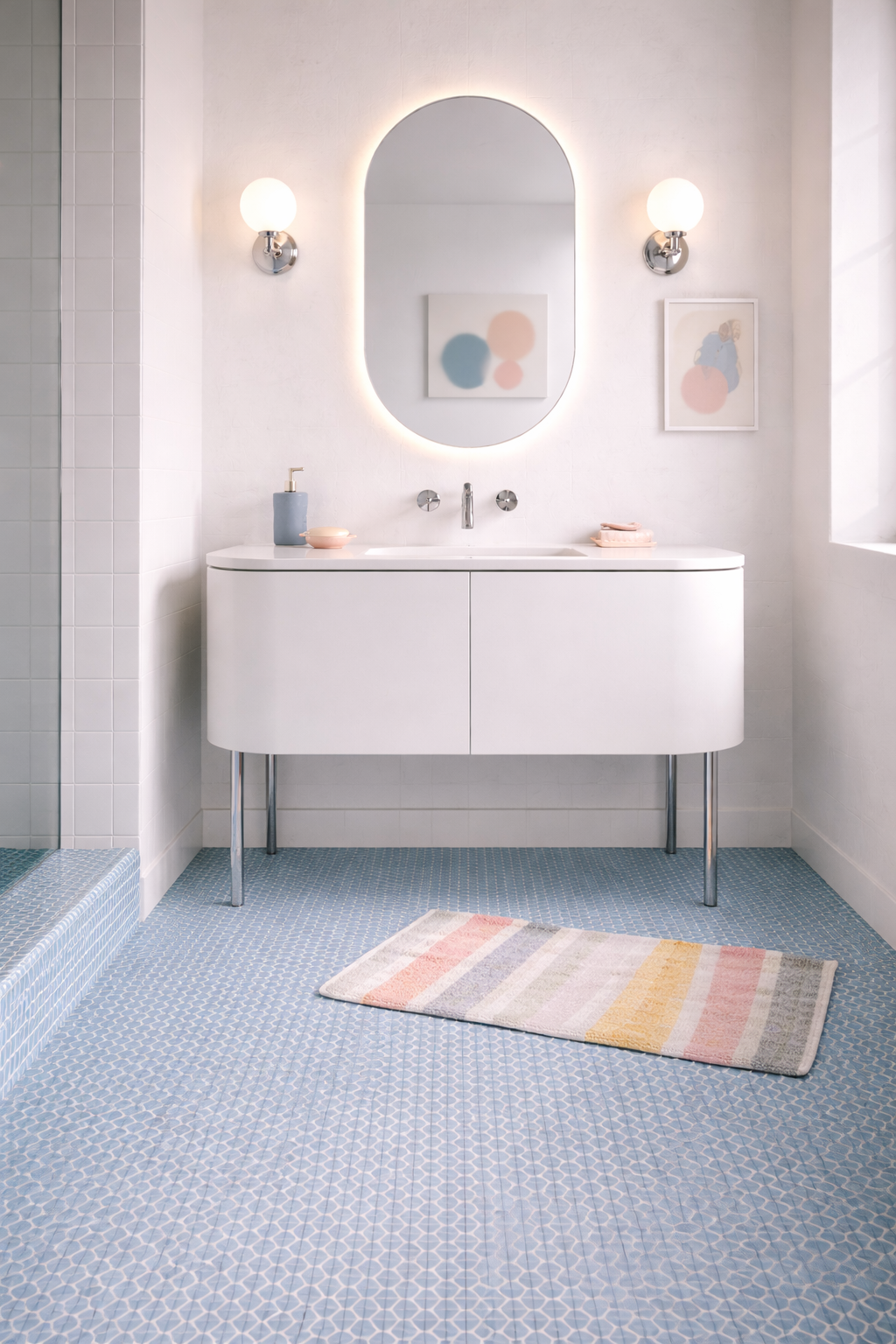 Channel a playful 60s mood with powder-blue penny rounds across the floor and shower. Curves and circles keep it fun.