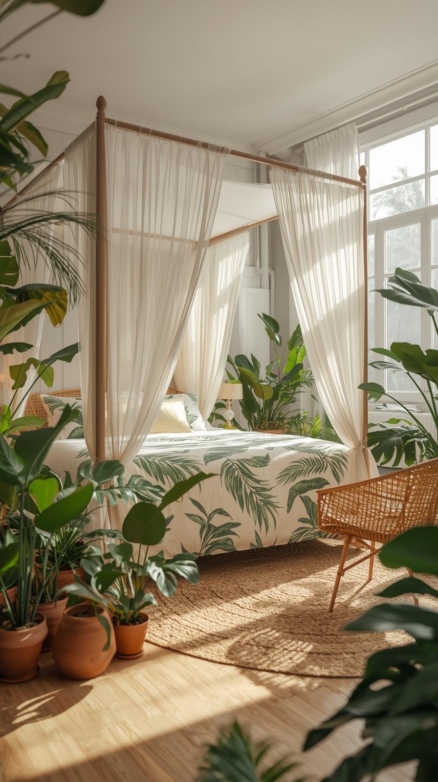 A leafy sanctuary with organic textures. Plants, botanical prints, and soft wood create a restful jungle.