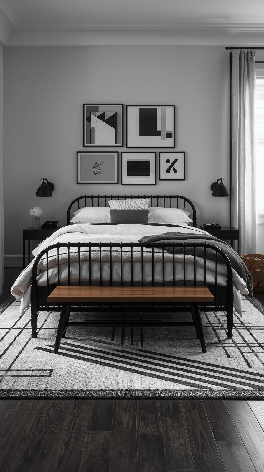 - Matte black sconces and linen curtains with black edging