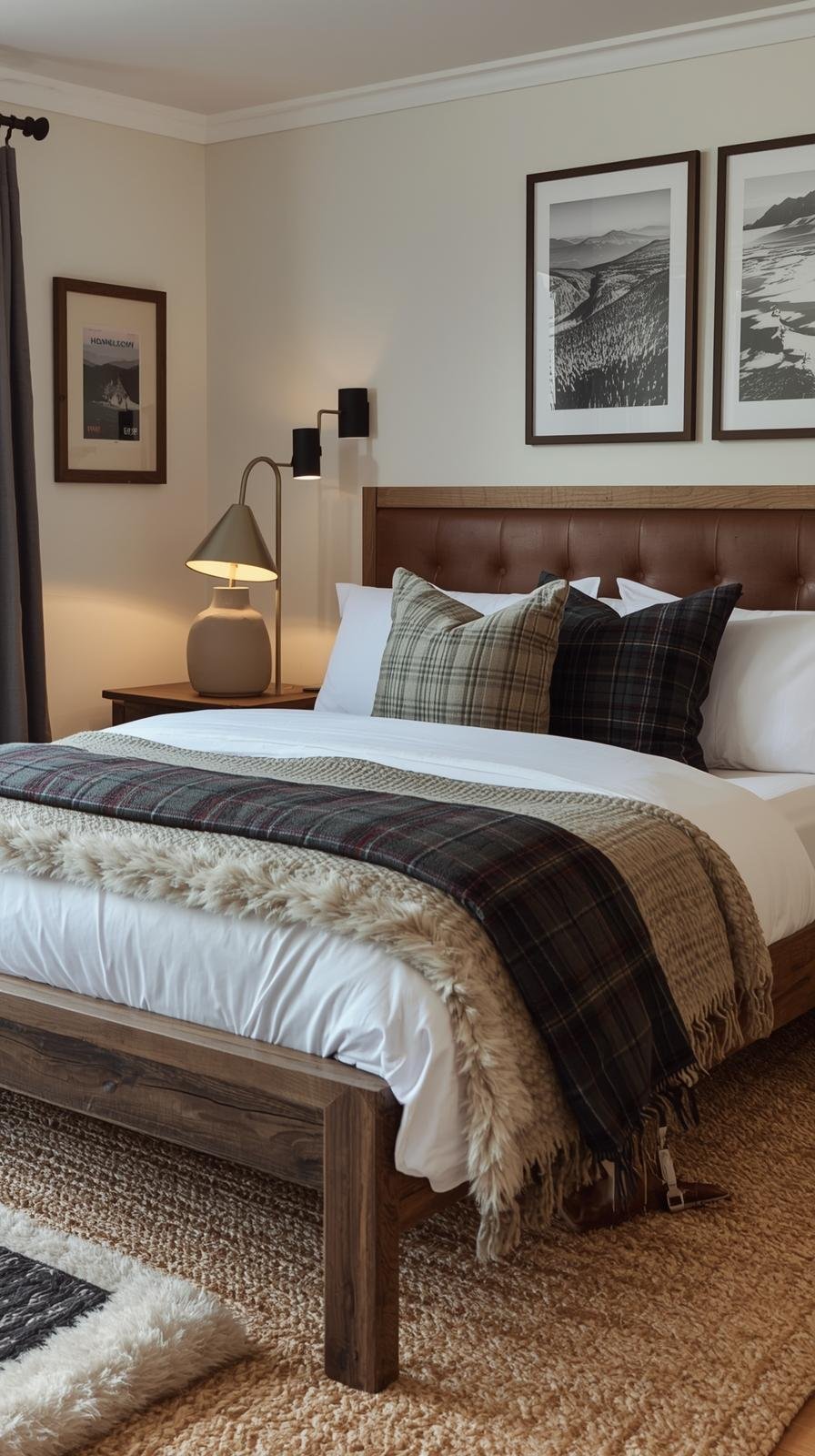 - Wool plaid quilt layered over crisp cotton sheets