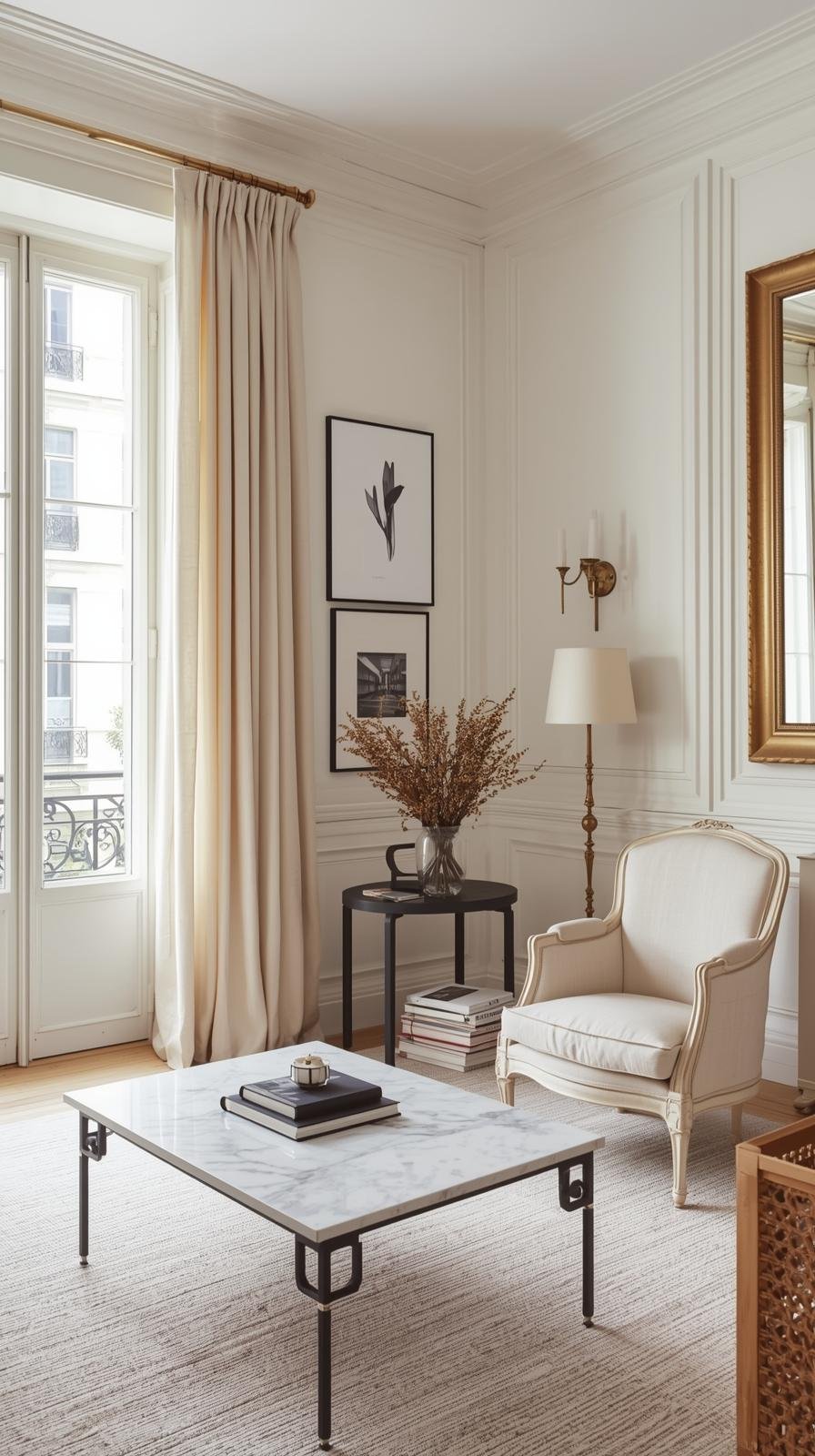 Think sunlit Haussmann vibes without moving to the 7th arrondissement. This look blends crisp white walls, ornate trim, and classic silhouettes with modern touches.