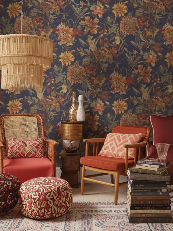 In the image, you can see how the floral wallpaper creates a warm atmosphere. The mix of flowers and leaves adds a playful vibe, while the dark background helps the colors pop. This combination makes it a great choice for accent walls or even smaller spaces.