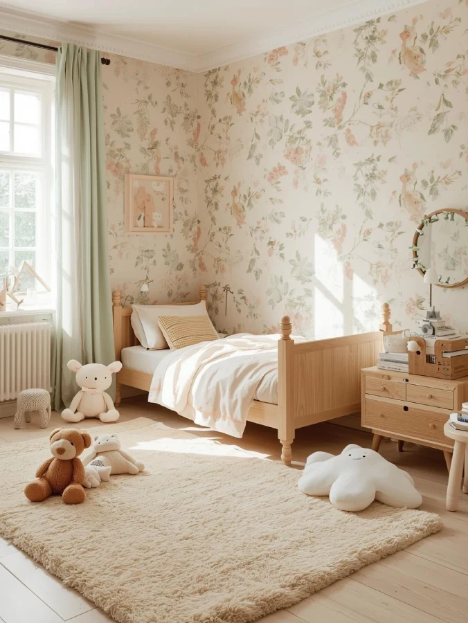 The soft hues of pink, blue, and earthy tones blend seamlessly, making the room feel warm and inviting. The floral wallpaper acts as a focal point, drawing the eye and adding character to the space. It’s not just about aesthetics; this style encourages a sense of freedom and individuality, which is essential for a child’s environment.