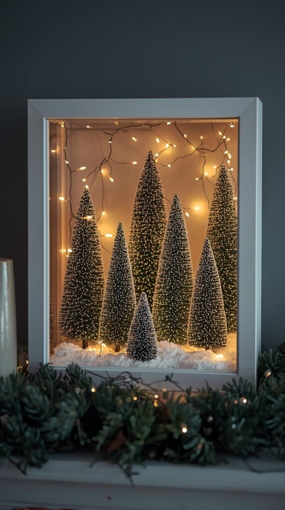 Stick with a neutral, wintry palette—white, silver, and forest green with just a hint of gold or red. If your aesthetic leans minimalist, skip the figurines and go for a snowy tree-lined scene instead. For a cozy farmhouse look, use a distressed wood frame and add a twine bow at the top. This DIY Christmas craft also makes a thoughtful handmade gift—it’s simple, elegant, and guaranteed to earn compliments.