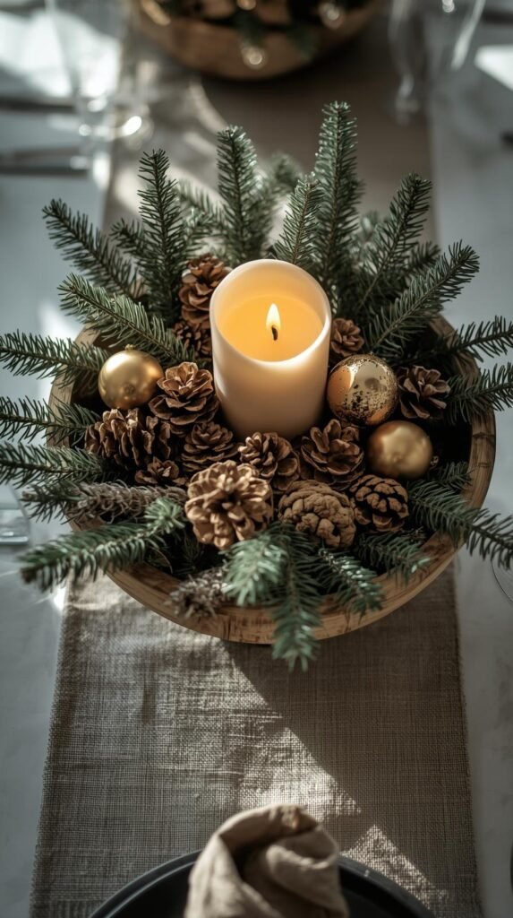 Stick to a cohesive color palette for a high-end feel—try ivory, champagne, or sage green. For natural warmth, surround your centerpiece with pinecones, sprigs of faux greenery, or gold ornaments. If you’re going for a minimalist aesthetic, line them down the center of your table on a neutral linen runner for that clean, Scandinavian-inspired glow.