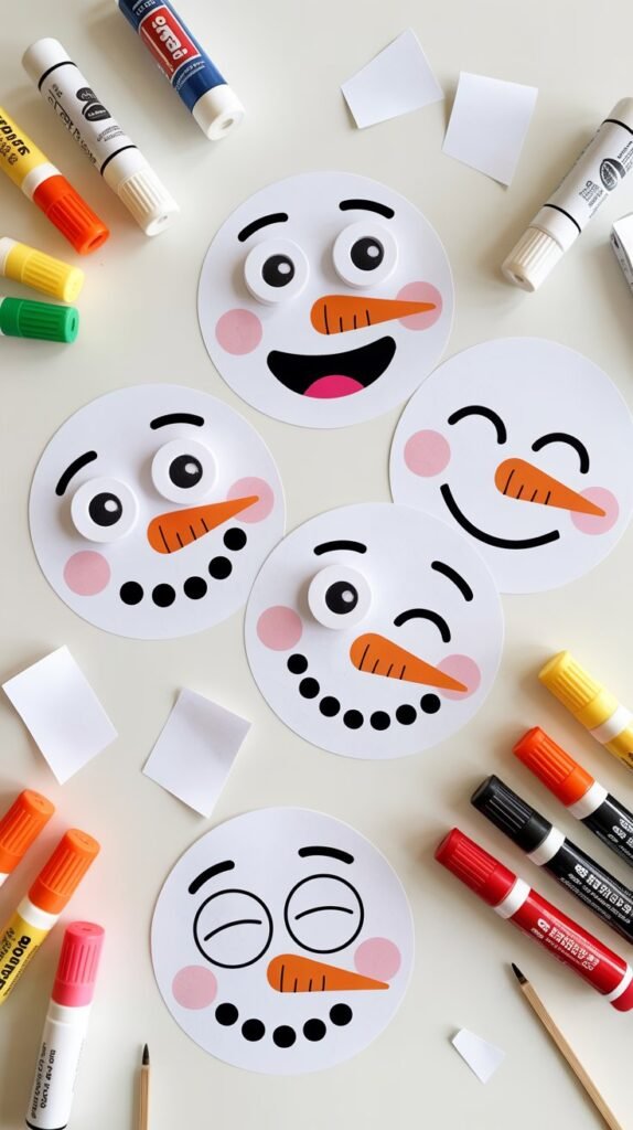 - Prepare the base: Cut large white circles from paper or cardstock for the snowman faces.