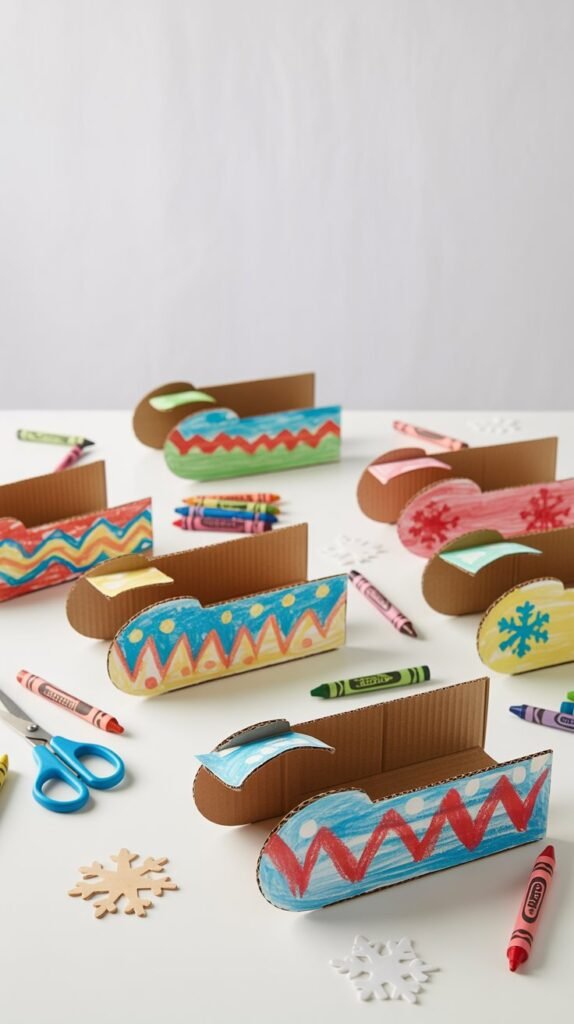 Cardboard sled art is a simple winter craft that focuses on shapes, color, and pattern. Kids can design their own sleds using markers, crayons, or paper pieces, making each one unique. This activity works well for mixed ages because the base shape stays the same, while the decorating level can vary. It’s a great option for quick crafts for kids that don’t require a lot of setup.