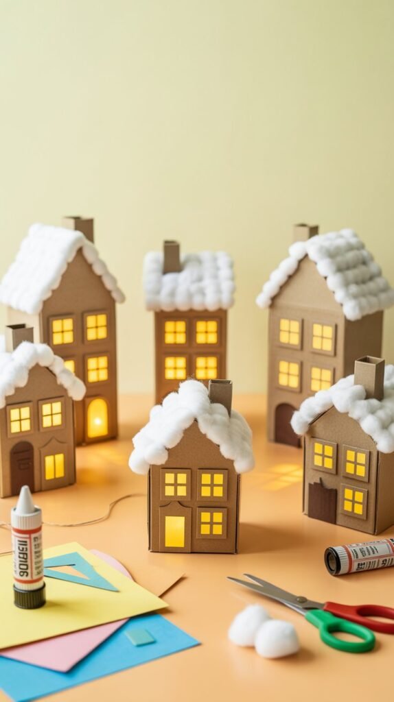 - Add winter details: Glue white paper or cotton to rooftops for snow.