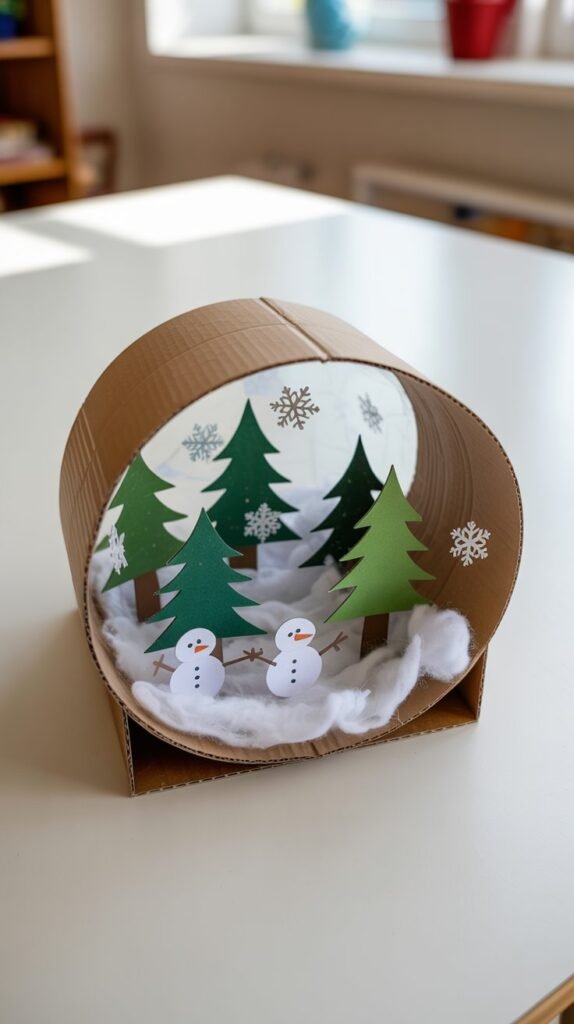 Cardboard snow globes are a fun way to let kids build a winter scene without the mess of real glitter or liquid. Each child creates their own snowy world using paper, stickers, and imagination. This craft works especially well for classrooms because every snow globe looks different, even when everyone starts with the same base. It’s creative, calming, and easy to display once finished.