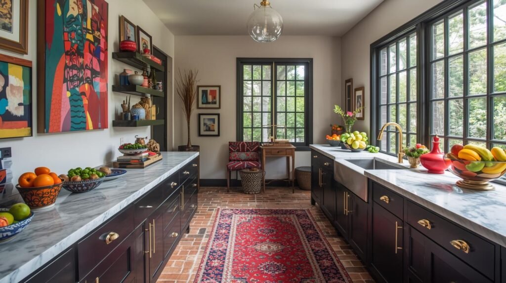 Blending old and new pieces is the fastest way to make your kitchen feel thoughtfully eclectic. A thrifted wood stool next to a sleek stone countertop or a vintage rug layered under modern bar seating creates contrast that feels warm and lived-in. The mix makes your kitchen look like it evolved over time instead of being installed in one day. This is one of the easiest ways to bring in personality without overwhelming the space.