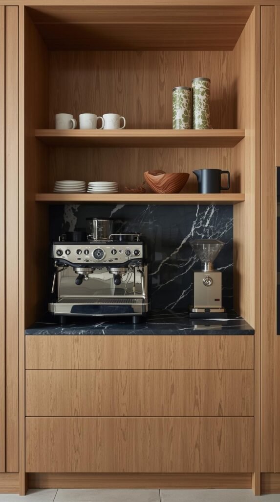 If counter space is limited, think vertical. Transform part of your pantry or a tall cabinet into a hidden coffee bar nook. Use adjustable shelves to fit your coffee maker, mugs, and canisters perfectly, then add a pull-out tray or lazy Susan to make access easier. This setup is ideal for small kitchens or renters who prefer a clutter-free look. Close the doors, and it disappears completely — open them, and you’ve got a sleek, mini café waiting for you. It’s one of the smartest modern coffee bar ideas for maximizing both space and style.