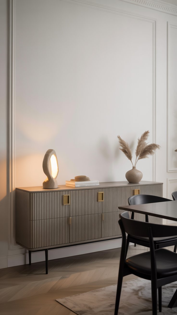 - Sideboards: Go for fluted fronts, ribbed wood, or slab doors with minimal hardware.