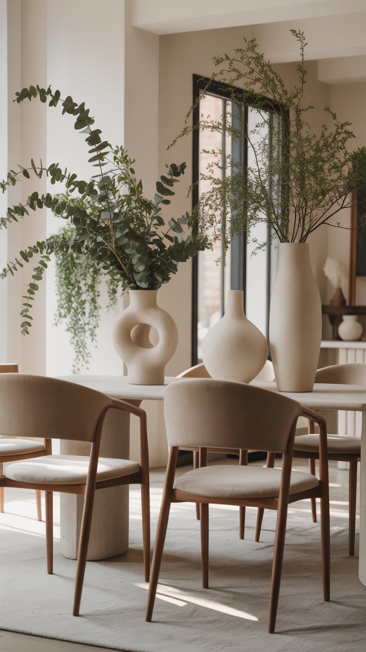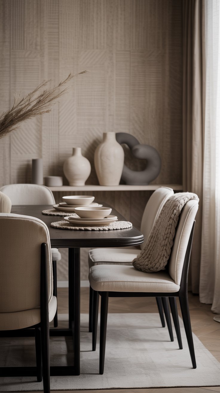 - Woven chairs + plaster-look walls + matte ceramic vases = subtle drama.