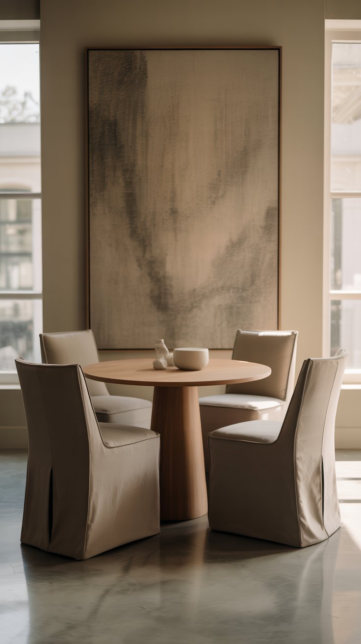 A stunning dining table sets the tone. Choose a sculptural base, think pedestal, drum, or geometric metal—and pair it with a clean, solid top. It reads modern without feeling sterile.