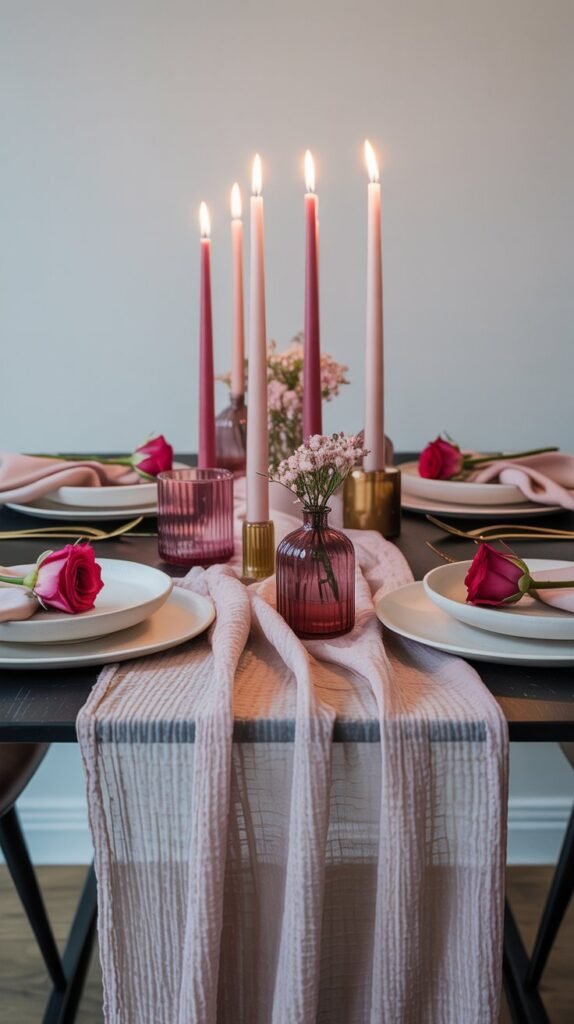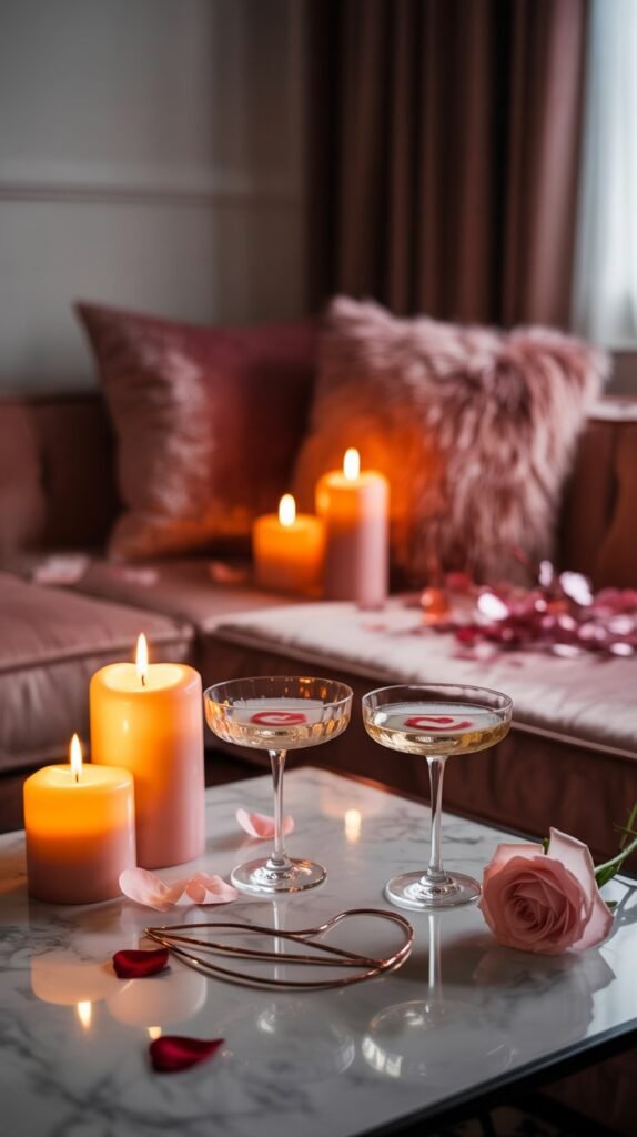 Forget the flat red-and-pink combo. The secret to elevated Valentine’s decor is a layered palette. Mix blush, raspberry, wine, and soft neutrals like cream or taupe. Add metallics—champagne, rose gold, or brass—to make everything feel expensive (even if it’s not).